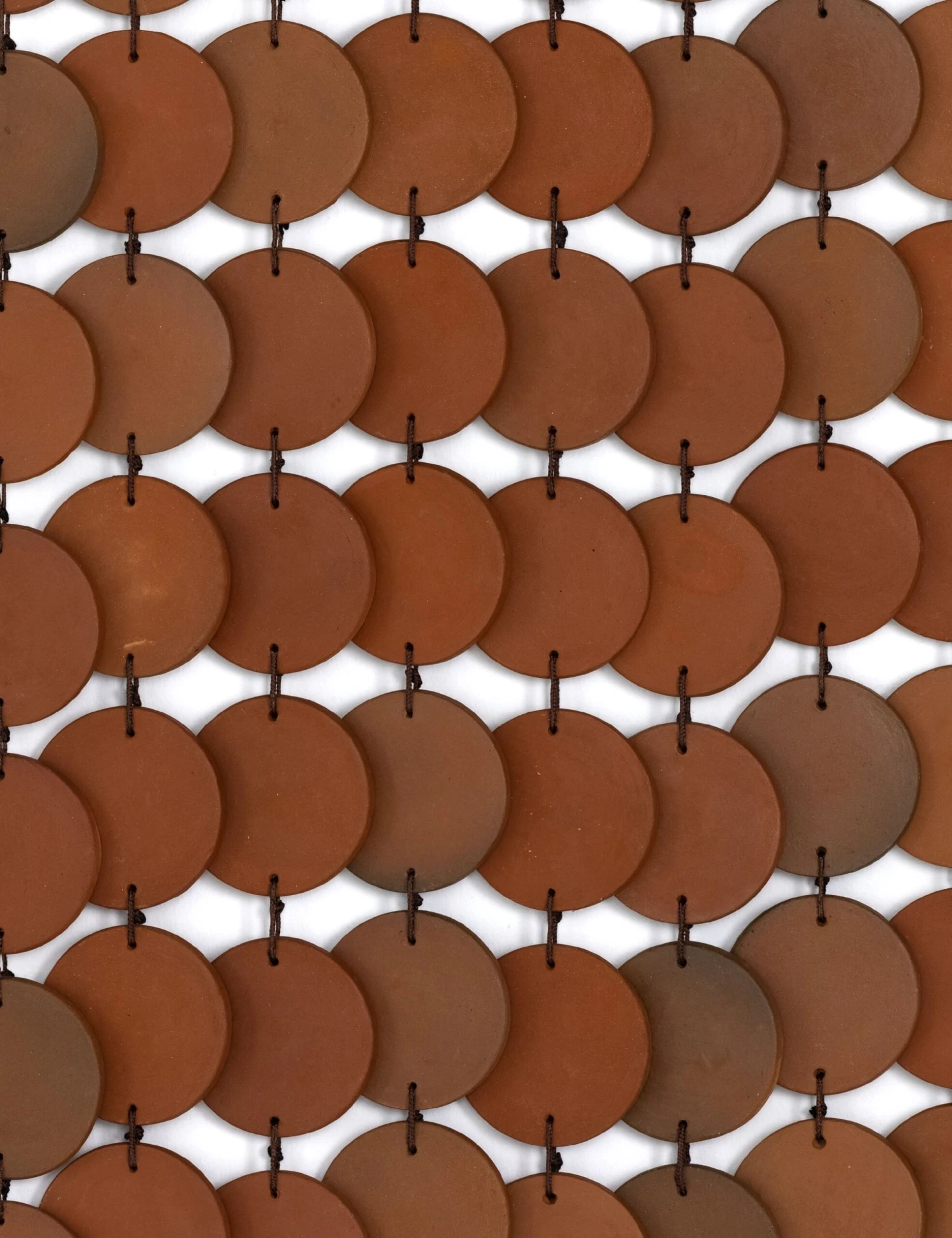 Simple elements are fashioned into a textural piece of wall art in this artisanal feature. A pleasing arrangement of layered cream ceramic disks hang from a slim black frame to offer a tactile dimension for a collected décor. Style this wall hanging with sculptural accents and natural woods for a laid-back, transitional space.
